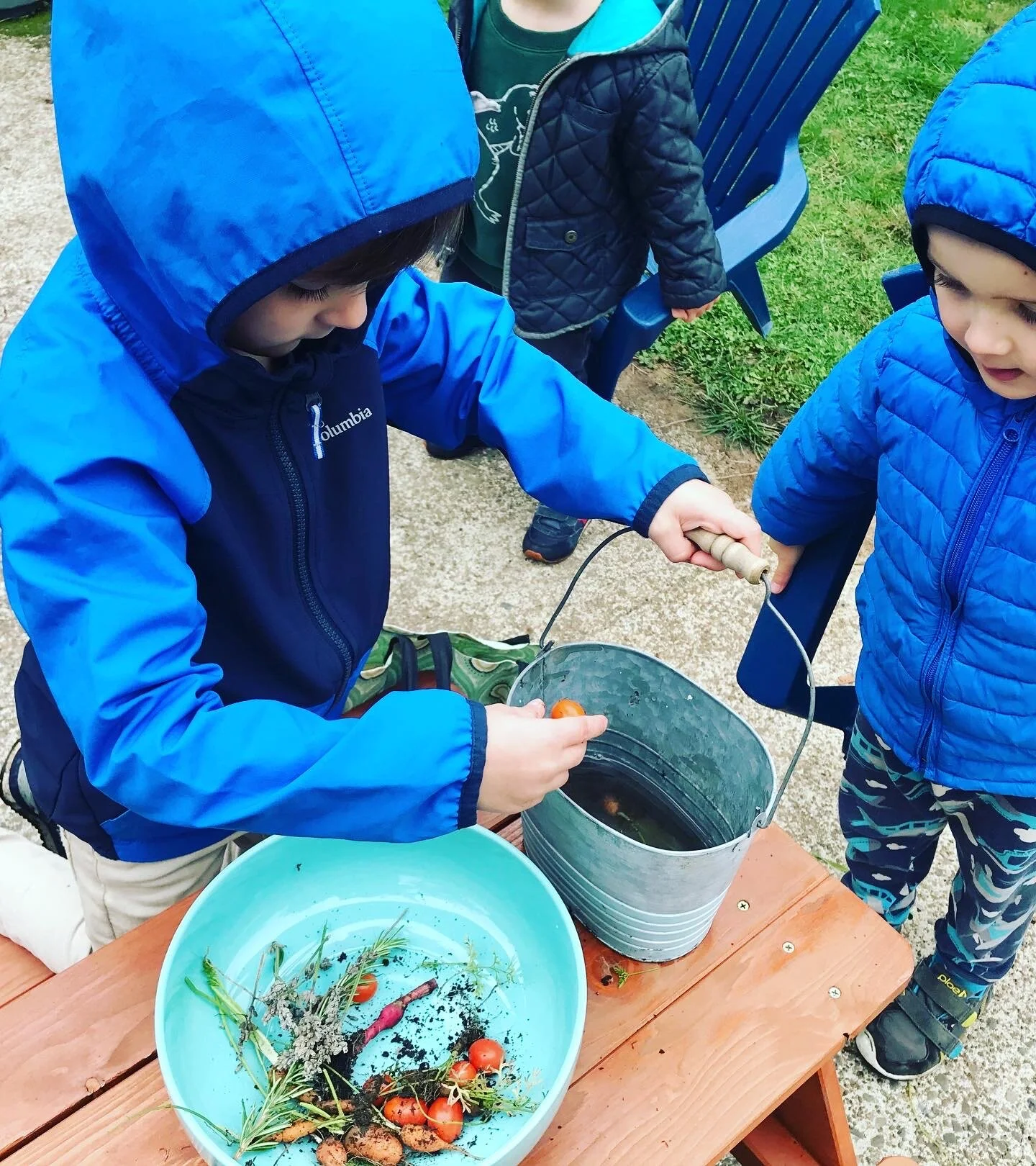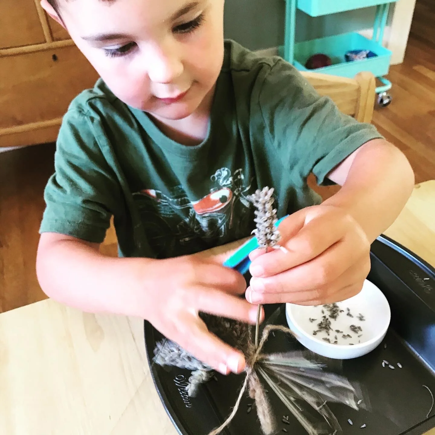 Preparing lavender from our garden to be used in child-sewn lavender pillows.